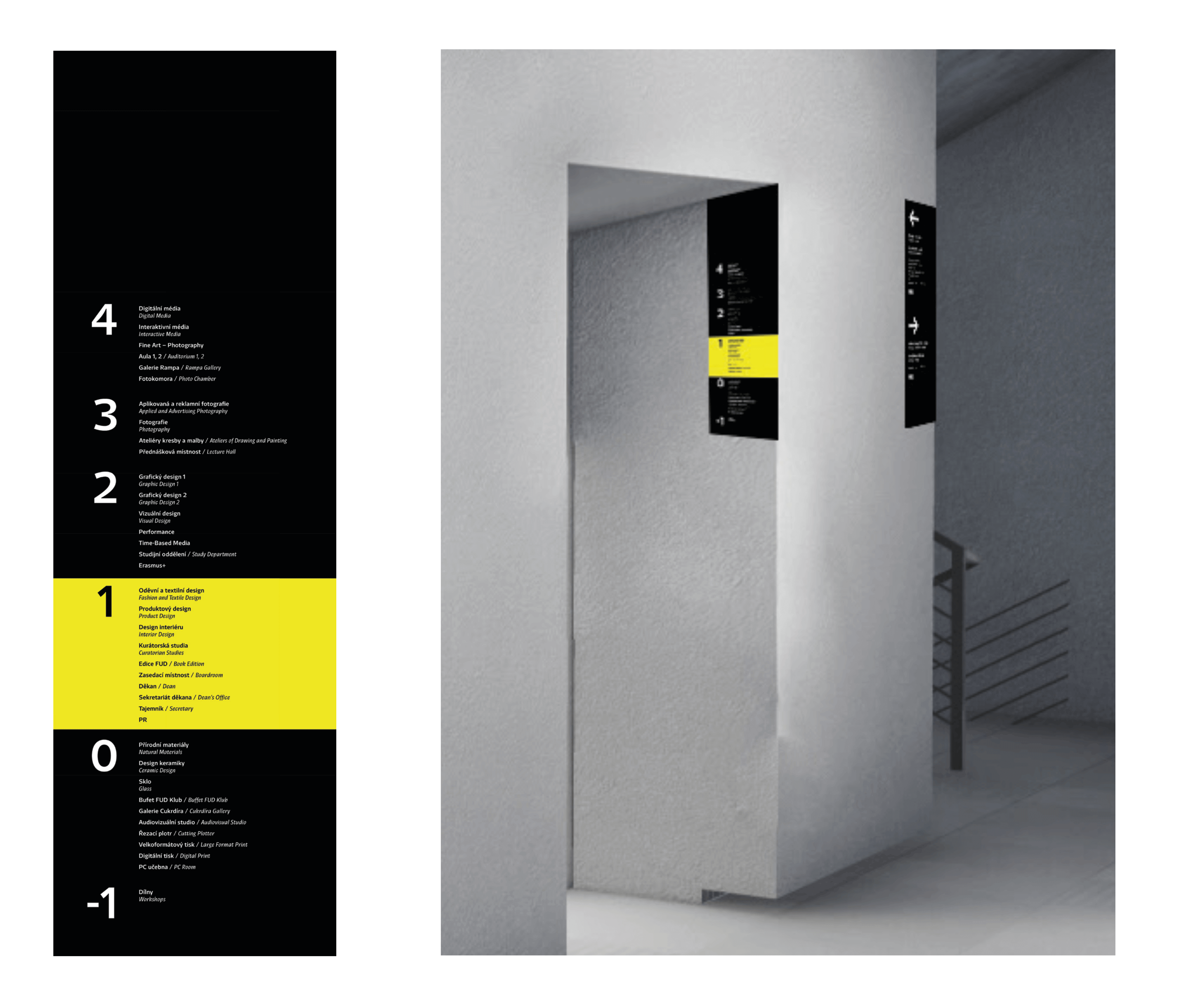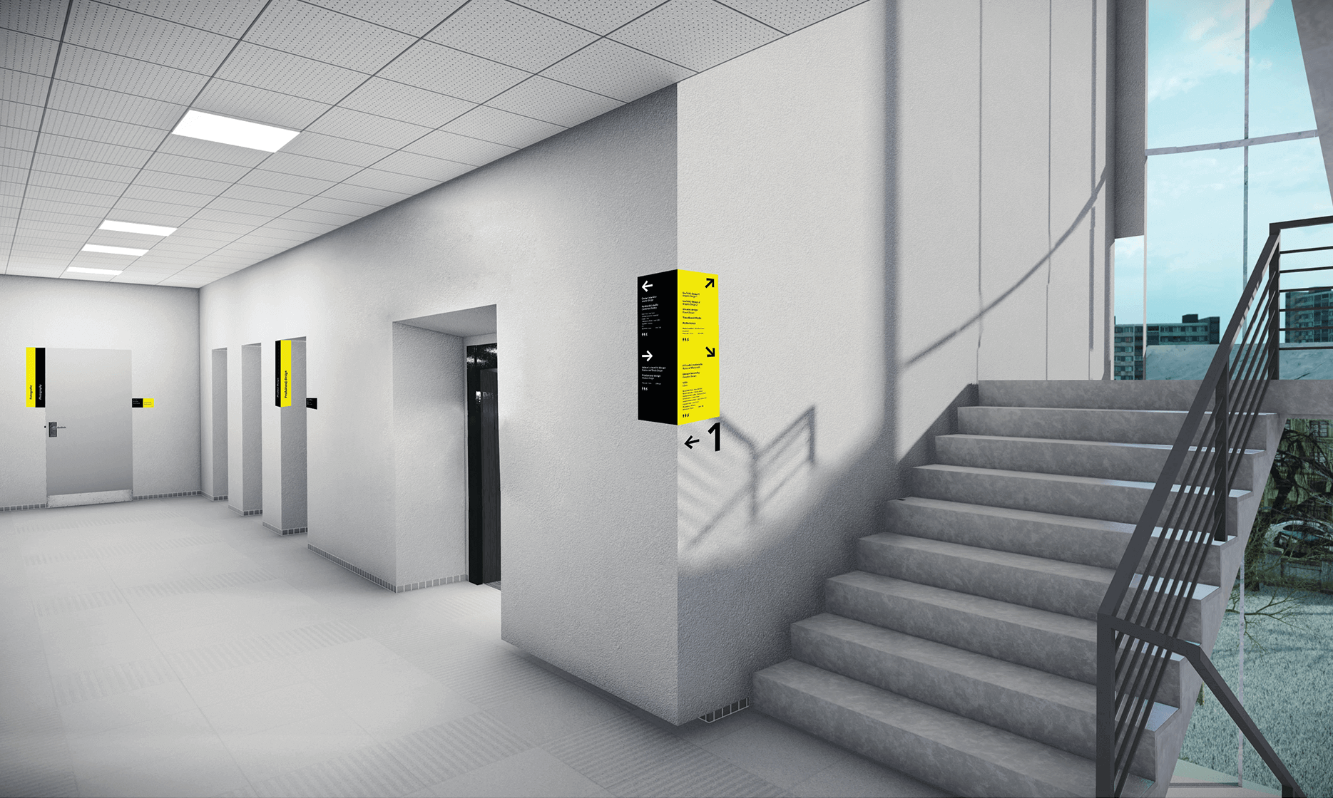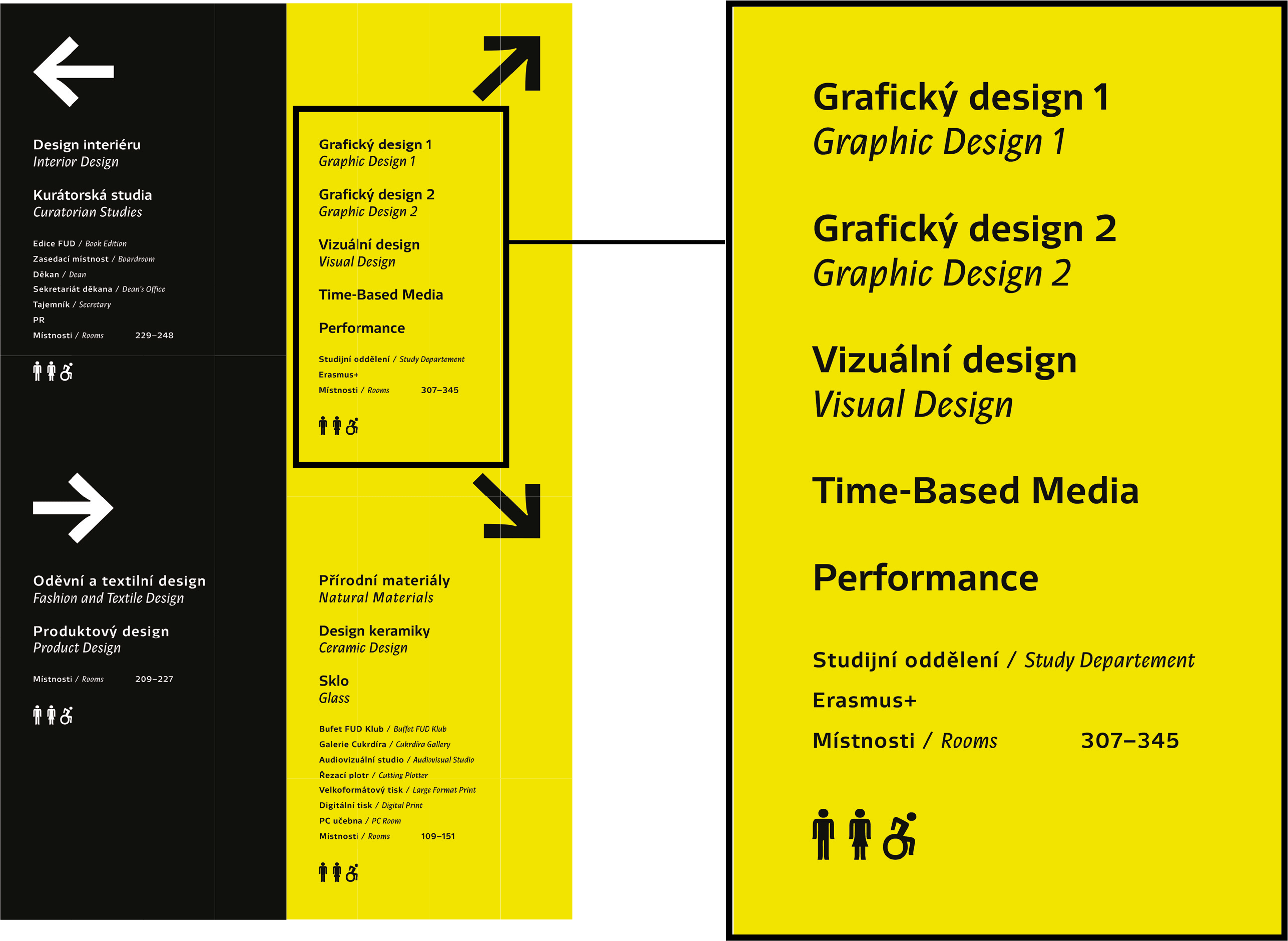 The design of the navigation in the FUD building included not only the design of the orientation solution, but also the creation of pictograms for the Inica font family. The color was chosen based on its prominence in a space that is dominated by different visual smog.